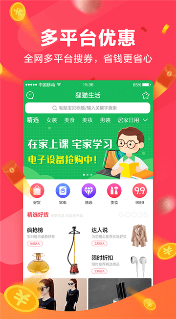 狸猫生活是一款聚集了各大平台优惠券的购物软件,在这里有大量低价正品好物可以任你购买,让你在网购过程中节省购物的钱,产品安全放心。
