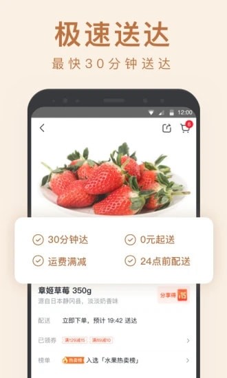 下单后最快30分钟急速送达,省去外出买菜、翘首等外卖的麻烦,够快才够新鲜,准时才够方便!