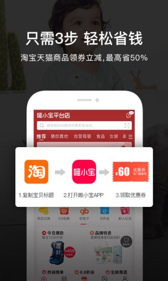 唯小宝app是一款专注于优惠购好物的手购物应用软件,在这里可以搜索到淘宝天猫等各大电商平台上隐藏的大额优惠券,最高可省50%,平台提供琳琅百货,一应俱全,满足日常生活所需,还在等什么,快来下载体验吧!