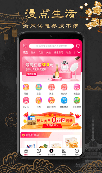 漫点生活app是一款手机网购类的应用软件,线上为您提供满意的电商服务,满足更多用户的需求。漫点生活app提供海量优惠券,比淘宝天猫直接买,省50%,绝对不花1笔冤枉钱。还有9.9包邮专场、限时秒杀等特色专区低价好物等你来抢!