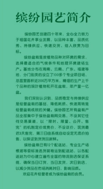 缤纷盆栽网是缤纷园艺属下,自产直销的盆栽批发网,实行会员制,凭本人会员号及密码上网交易。会员号只允许所属会员本人使用。会籍不得转让,帐户不得借人使用,违者将被收回会员号,并终止会籍,会员费不退。密码是会员的重要个人资料,需认真设置、管理与使用,凡使用本网帐户和密码办理的业务,均视为会员本人亲自办理。