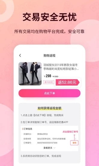 4.安全可靠:交易、支付均在电商app完成,APP内仅查询和返现
