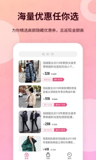 搜优惠券:全品类搜索隐藏优惠券,下单前即可领取,可省钱80%。