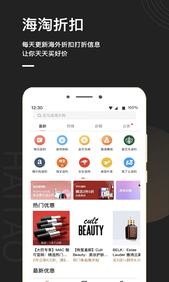 海淘全球购海外购物还能赚返利,折扣天天有,省钱。平台与国内肯德基,星巴克,淘宝,京东,美团外卖,饿了么等合作,优惠券让你能省得更多,返利得更多。