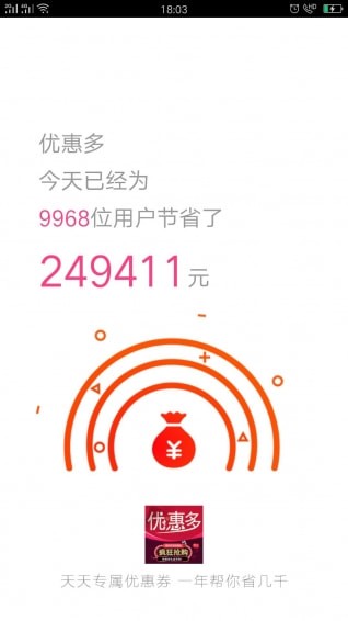 优惠多,一款最大程度省钱的网络购物软件,平台每天定时定点公布大字报,智能分析每日平台共为用户节省多少购物基金,与淘宝天猫合作,发布大量商品优惠券,折扣商品数不胜数,给与用户最节省的购物体验感。
