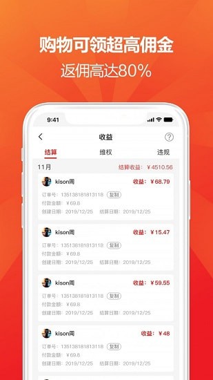 3、返利订单实时查询,已结算、未结算、已失效订单与返利收益绑定,实时查看收益结算一目了然。
