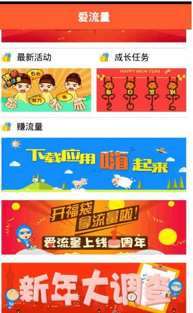 此外,在爱流量首页中,滑动界面到赚流量专区,可以看到下载应用赚流量,新年大调查,开福袋拿流量,还微公益活动赠送流量,点击相应的界面,进入之后会有详细的活动规则及流量赠送说明,按照步骤进行操作即可。