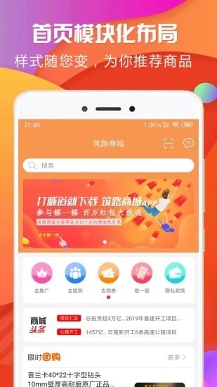 筑路商城是一款专为公路建设服务的商城,为行业带来专业的机器设备、材料、五金配件等等产品,都是厂家直销,保证质量有保障,同时还提供人才招聘、设备租赁等等服务,有需要的朋友可以下载了解~