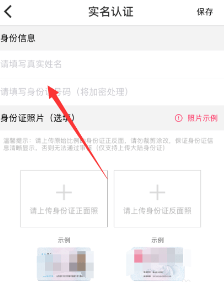 进入身份认证页面后,如下图所示,完善你的身份证信息,上传正反面即可
