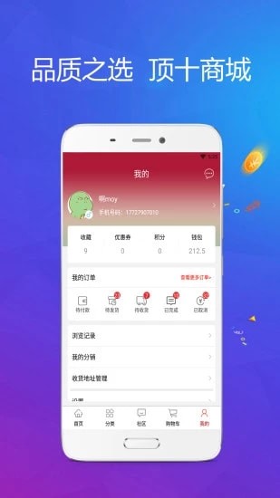 顶十商城是一款不错的购物平台,海量品质商品任你选购,而且价格低廉,都是厂家直接进货,质量保证的同时为你带来最低价格,而且新人注册更是有现金抵扣红包,优惠多多,省钱多多!心动的朋友就赶紧下载吧!