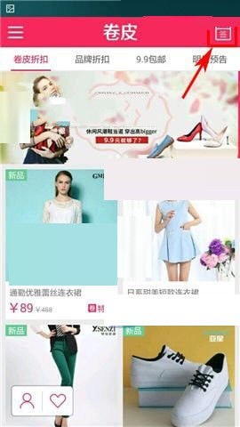 1、打开卷皮折扣app,点击右上角的【签】,再点击【积分商城】。(如下图)