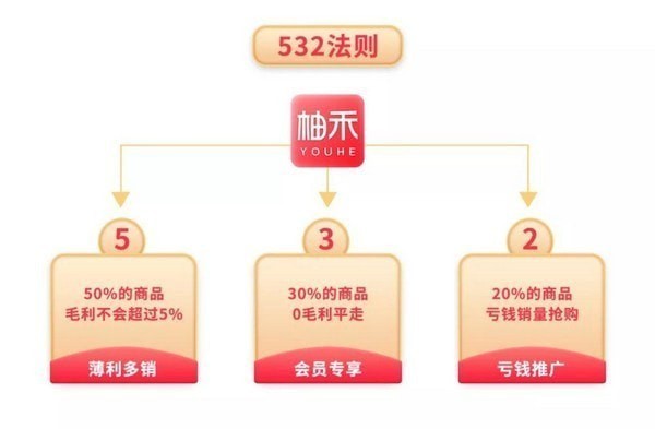首先,柚禾有自己定价标准,商品加价实行532法则,其中20%的商品为赔钱限量引流,30%的商品为本钱出售,50%的商品盈利限定毛利不超过5%,商品在柚禾基本平来平走,最终把利润全部让利给会员。
