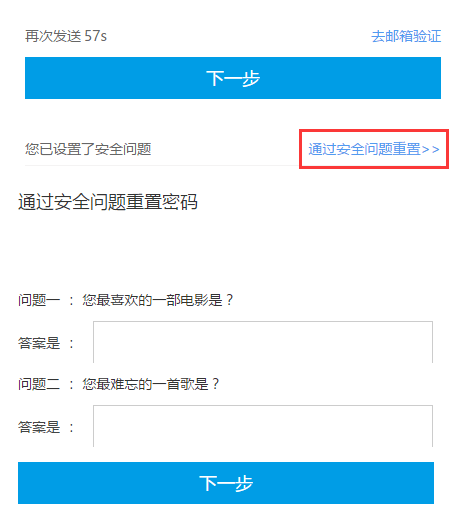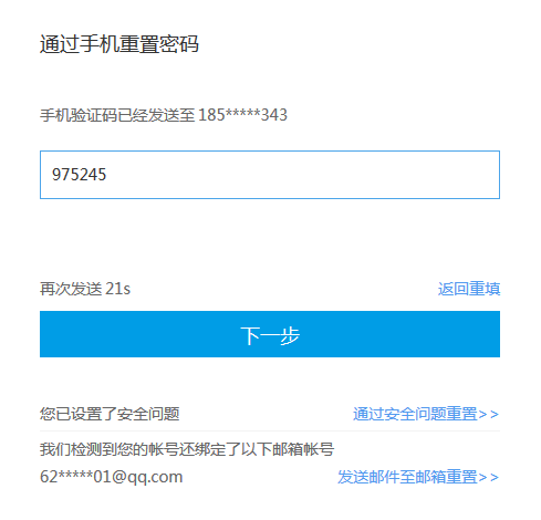 注:如手机或邮箱无法接收到验证码,但设置了安全问题,可选择“通过安全问题重置”方法找回;