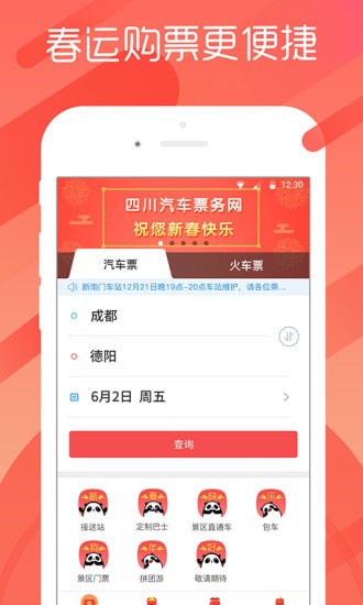 1、提供四川省内汽车票预订和购买服务。