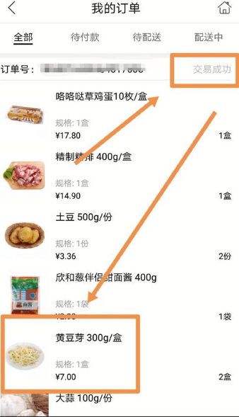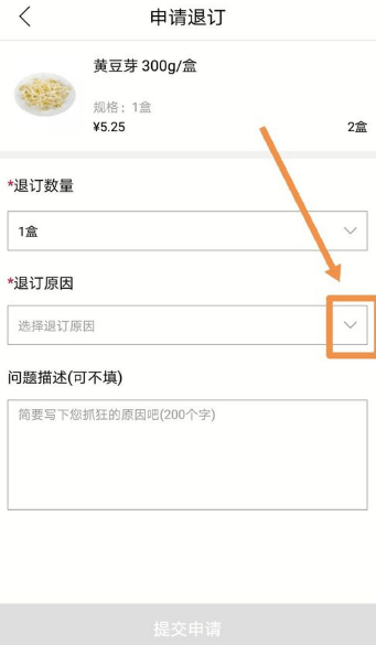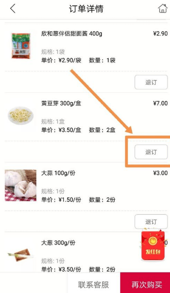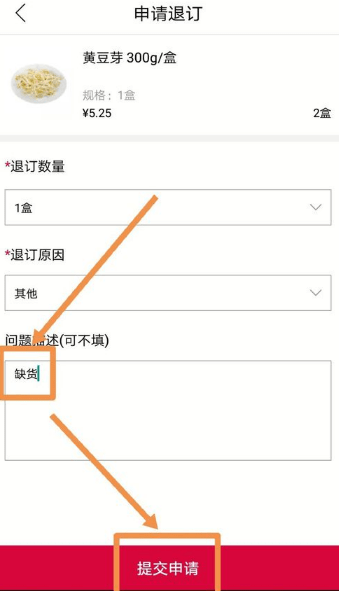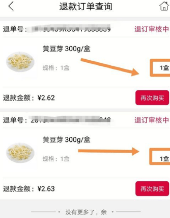 要退款的是最近一笔订单中的某个商品,点按其中要退款的商品,该商品是黄豆芽,购买了两份,由于缺货,需要退款。