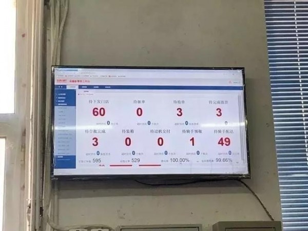 淘鲜达的配送是5公里1小时达,快拣仓墙上的一块屏幕实时显示:刚过中午就有595个订单,准达率100%,仓内履约率99.66%。