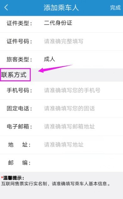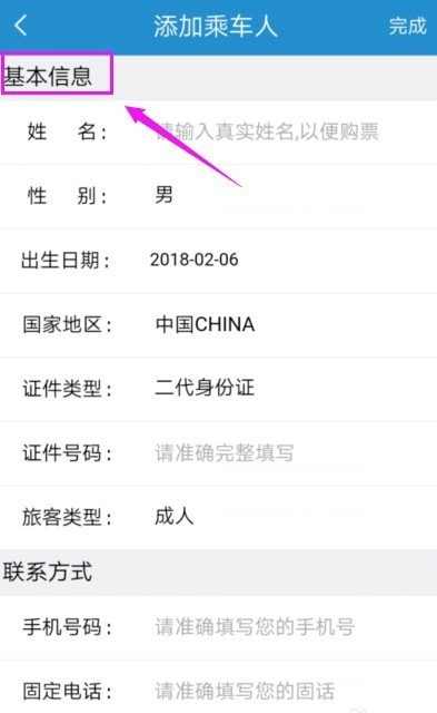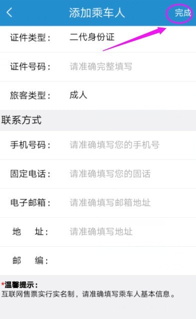 最后,填写玩,点击“完成”,这样就可以添加新的乘车人了。