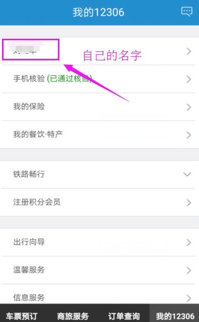 在我的12306这个位置,我们点击下自己的名字位置,如图。
