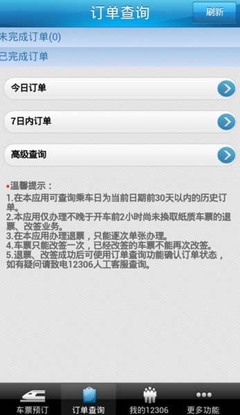 2.与www.12306.cn网站购票功能保持同步,可在手机和网站之间交叉办理购票、退票、改签等业务。