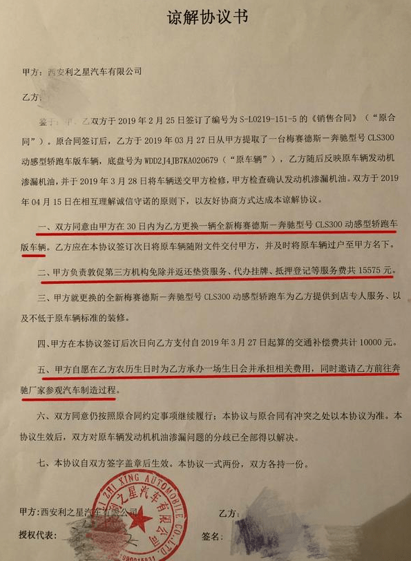 协议主要内容如下:(注:甲方为西安利之星汽车有限公司,乙方为女车主)