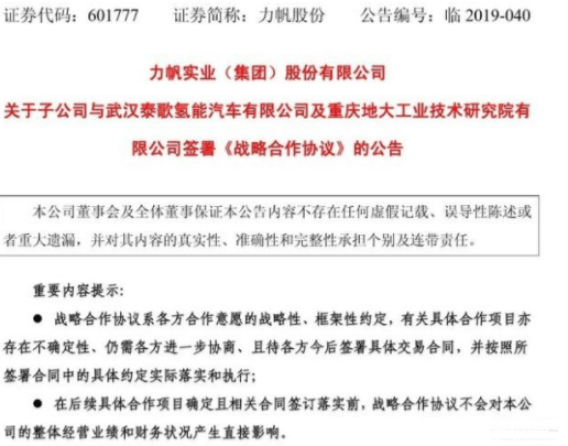 4月14日晚,重庆力帆乘用车有限公司(简称“力帆乘用车”)发布公告,宣布与武汉泰歌氢能汽车有限公司(简称“武汉泰歌”)、重庆地大工业技术研究院有限公司(简称“重庆地大”)两家公司合作。三方在重庆签订《战略合作协议》,共同提升氢燃料电池发动机研发实力。