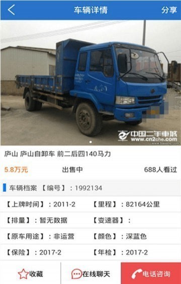车源详情:车辆详情页面中,点击右上角可分享给你的微信好友,朋友圈,新浪微博等,详情页中详细展示了车源的各项数据,页面底下可以点击收藏,若您看中了这辆车,可以点击电话咨询,app将自动提取电话号码提示您是否拨号吗,节省您记住电话号码重新拨号的时间和麻烦。