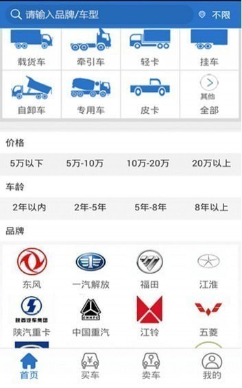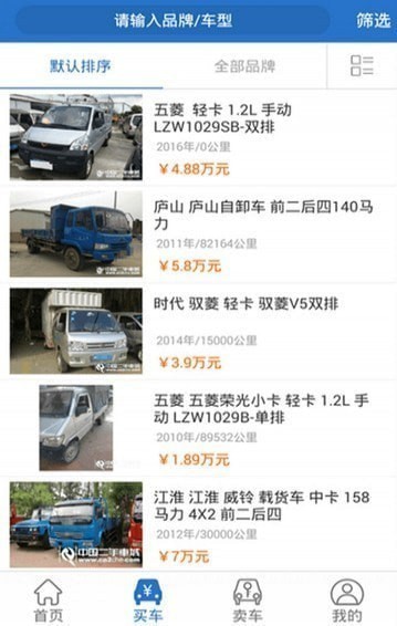 买车:点击买车,默认随机显示您所在城市的车源,点击筛选,可根据地区,品牌车型车源,价格区间车龄区间里程区间等详细条件,筛选出您想要的车源。默认排序下有价格最低,价格最高,车龄最短,里程最少等排序条件。点击全部品牌,将会出现全部的火车品牌,供您查看选择。