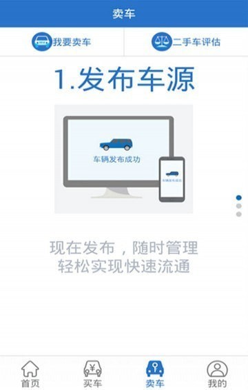 卖车:点击我要卖车,根据提示上传图片,填写各项资料,快速发车。点击二手车评估,填写各项资料,系统将根据您填写的车的情况估算二手车的价值。