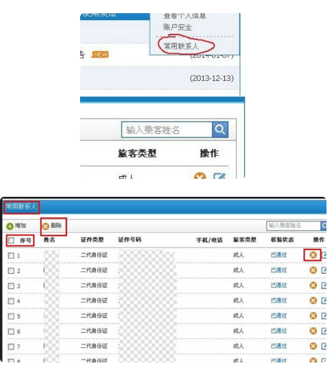 进入后在左侧有个【常用联系人】,点击进入,所有用该账号购买过车票的人都显示出来了,在后面有删除、操作。,点击删除,直接就把乘客删除了点击操作,就可以修改乘客信息。