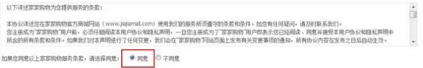 第二步:认真阅读家家购物服务条款,点击同意(系统默认值为同意)