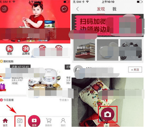 打开快乐购进入软件后点击下方导航栏【晒】,接着点击下方中间【相机】。(如下图)