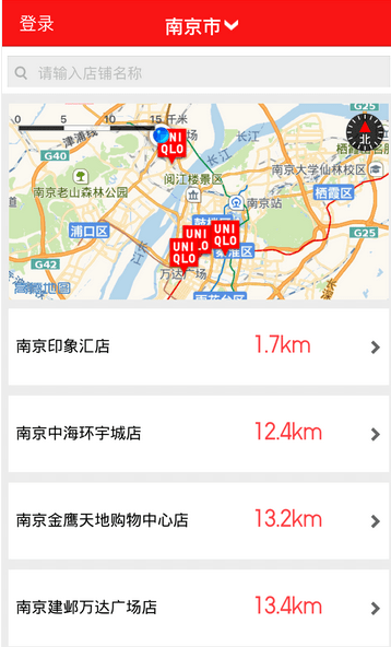 右屏幕主要展示附近的4家优衣库店铺,可以根据指定条件查找,还可以在地图上进行查看。