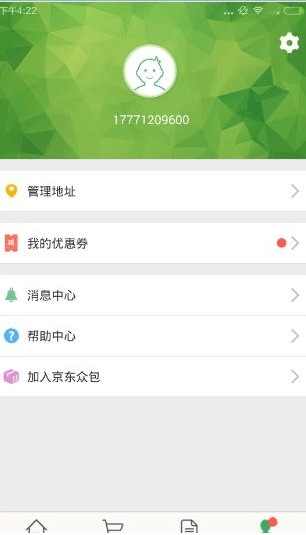 在我的界面,您可以管理收货地址,查看您的优惠券,可以加入京东众包等等