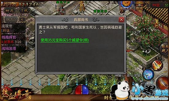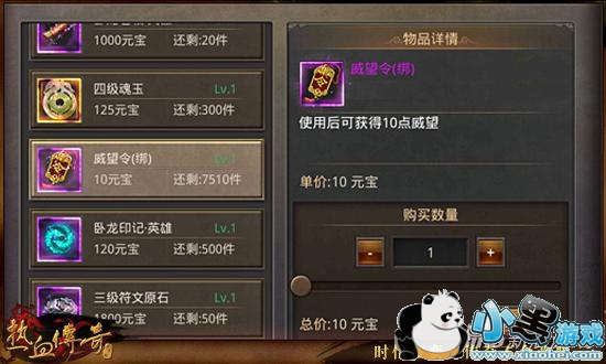盟重云游商人处有出售绑定威望令,价格为10元宝一个。单看这个价格是不贵,但是我们想要把爵位升到顶级,需要的威望令数量可不少,只有土豪玩家能承受得起。