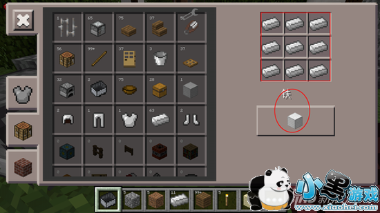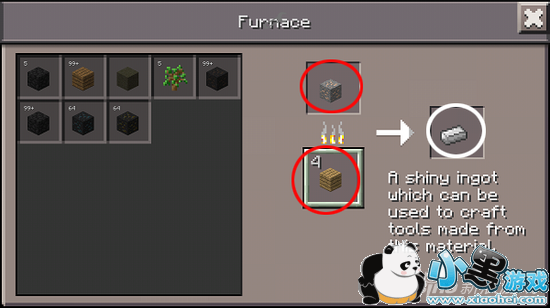 两种材料中间有个火在烧,烧完一次就代表一个铁锭熔炼成功,如下图,可以用九个铁锭在工具台合成铁块。