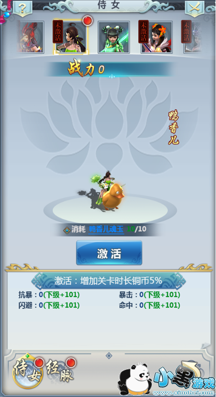 侍女激活后即可获得侍女技能以及侍女属性,玩家只能出战一个侍女。侍女碎片可以提升侍女基础属性,每五个碎片可以提升一次。每个侍女有专属技能,技能效果各有优势。