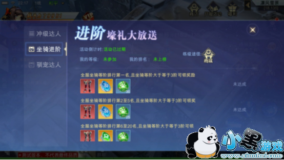 | 坐骑等阶排行第2至5名 且坐骑等阶大于3阶 | 七阶2星红装靴子*1、坐骑飞升丹*1、猫宠进阶丹*25 |