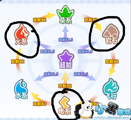 零磕玩家:电系精灵克制超能系精灵;岩石系克制飞行系精灵;火系精灵克制草系精灵。这样可以通过换阵对多种精灵进行有效的克制。