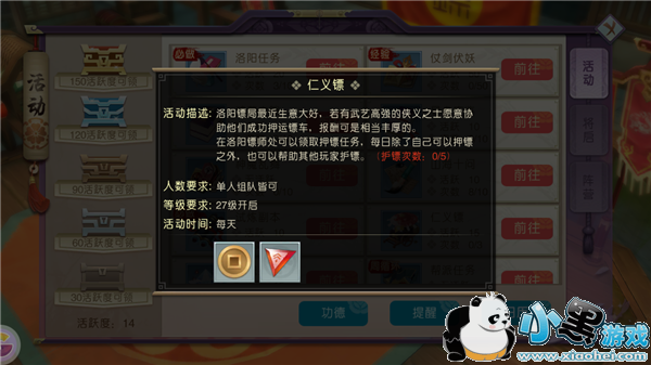 洛阳镖局最近生意大好,若有武艺高强的侠义之士愿意协助他们成功护送镖车,报酬可是相当丰厚的。各位大人的等级达到27级之后即可参与到这项活动中来,活动参与的时间为全天哦!
