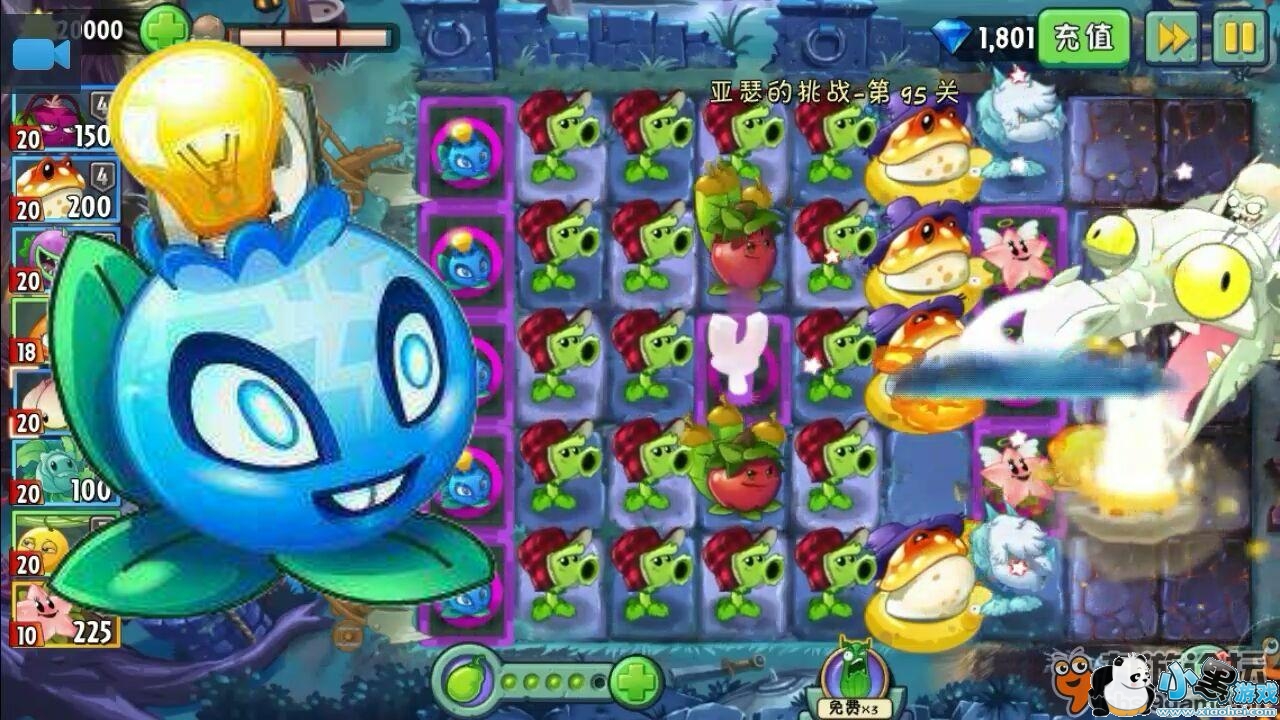 图中天使电击蓝莓负责主输出,正常关卡中没有任何卵用。磁力菇控制boss,地图正中央,同时与后五蓝莓前三天使形成比较美观的阵容搭配。二四路两个苹果为了防止三路因原豌的缺少而使僵尸有机可乘,两个冰龙草为了补下天使留着的空缺。同时加强一五路的控制。对二三路也起到了保护作用。