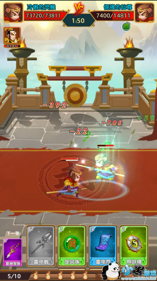 竞技场和降妖中必须且最多上阵八个法宝,而战斗中同时存在、可以使用的只有4个法宝,还有一个位置显示下一张随机出现的法宝。