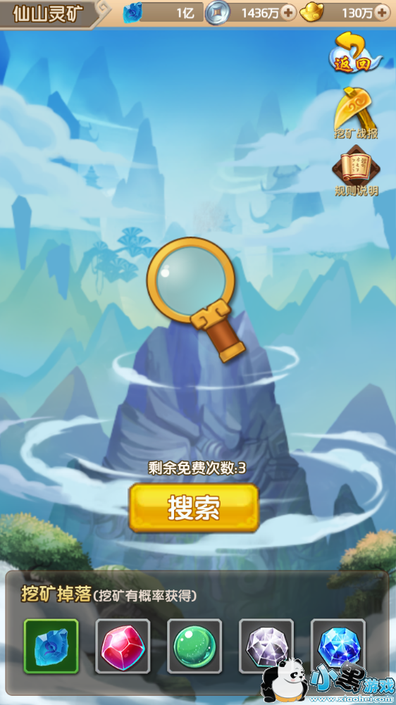点击搜索按钮开始搜索,搜索规则为:如果玩家未挖矿,则先搜索矿脉,如果玩家已在挖矿中,则搜索其他正在挖矿的玩家。玩家每天拥有三次免费搜索次数,每天凌晨0点刷新免费次数。