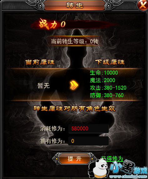 转生需要消耗修为值,转生等级越高,属性加成越多。
