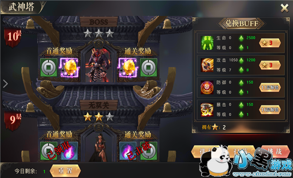 6)每通关1层,可得到相应的星星数,在武神塔界面buff栏处可通过积累的星级,解锁不同的buff,助你通关更高层数。每次武神塔重置后,buff栏同时刷新为初始状态。