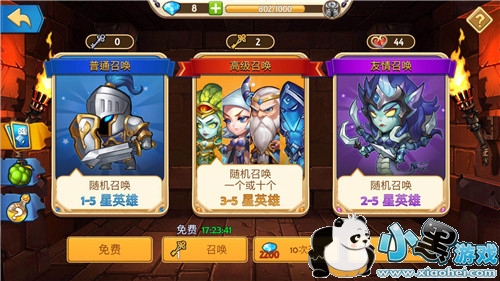 进入主界面的【英雄坛】,每48小时有一次免费的高级召唤,也可使用黄金钥匙。