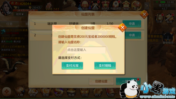 《成王败寇》中,一直跟着主线任务走,44级时会解锁仙盟功能,创建仙盟需要消耗200元宝或者2000000铜钱,取一个霸气的名字(不要和现有仙盟同名哦),选择支付方式即可;加入仙盟则只需要在你喜欢的仙盟后面点击申请,然后等待盟主批准,就可以进入了。