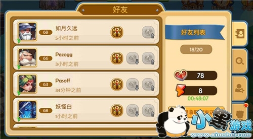 好友列表可看到所有的好友及在线情况,并且可以赠送友情之匙,攒齐10个友情之匙可以去英雄坛进行【友情召唤】,随机召唤2-5星英雄。