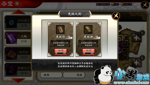 想必主公也很烦恼,如被敌军恶意针对,心中烦闷,如何解决?唯有“免战”以绝后患!只用花费少许元宝即可购买“免战牌”在免战时间内防止敌军抢夺自己珍贵的宝物!