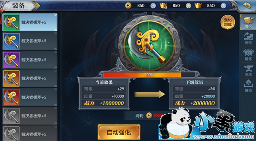 装备强化100%成功,装备强化方式调为消耗银币累计经验值升级的方式,每次强化需要消耗银币增加强化值,会根据强化等级的不同,强化费用和增加的强化值也不同,积累强化值才能提升强化等级,装备整体强化全部达到一个强化等级的时候会获得额外强化的属性加成