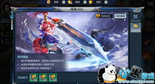 在战场里面,所有玩家的幻化外观显示为同一种一阶形态,统一名称,玩家只有靠自己在战场里发起进攻,天神战场中有不同的楼层划分,玩家所在层中累计击败足够玩家后,自动提升到上一层,但是在层中累计死亡一定次数后,有概率掉落至下一层,玩家首次升到更高层时会获得高额奖励